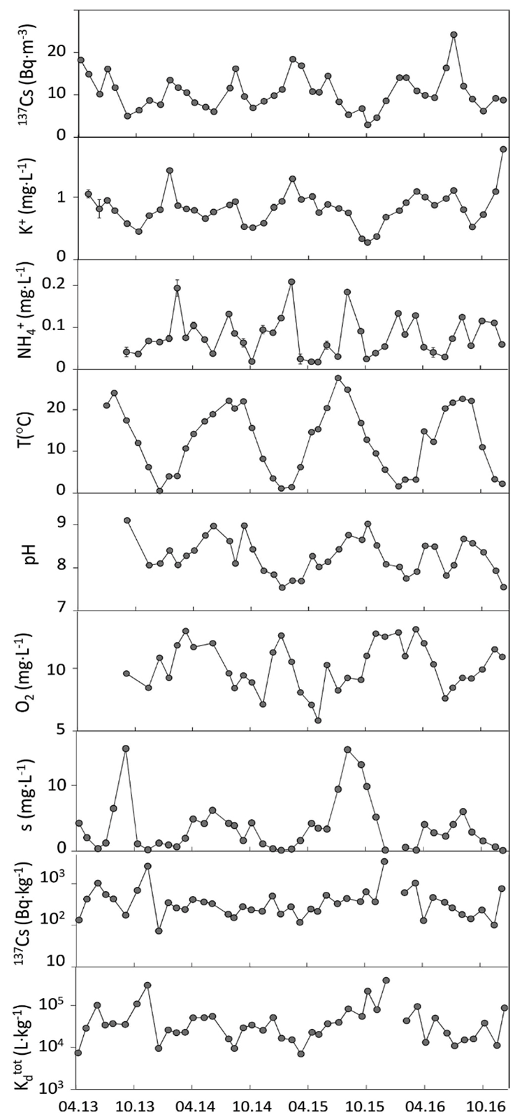 | Abstract | This data set includes dissolved and particulate 137Cs activity concentration in Lake Vorsee. K+ concentration, NH4+ concentration, temperature (°C), pH and O2 concentrations, concentration of suspended matters, and solid-liquid distribution coefficient Kd are also included. Detailed processing methods and data are published in below papers. Ries, T., Putyrskaya, V., Klemt, E. (2019) Long-term distribution and migration of 137Cs in a small lake ecosystem with organic-rich catchment: A case study of Lake Vorsee (Southern Germany). J. Environ. Radioact. 198, 89-103. https://doi.org/10.1016/j.jenvrad.2018.12.017 | |